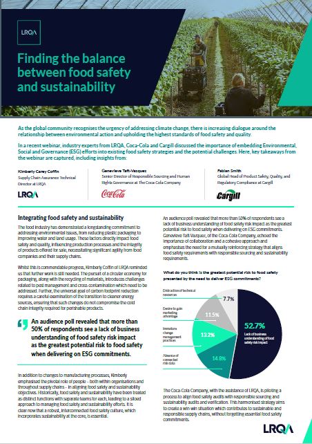In a recent webinar, industry experts from LRQA, Coca-Cola and Cargill discussed the importance of embedding Environmental, Social and Governance (ESG) efforts into existing food safety strategies and the potential challenges.
