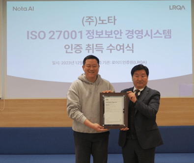 12월 4일 노타 AI 서울 사무실에서 ISO 27001:2022 정보보호경영시스템 인증 획득을 축하하는 인증 수여식이 진행되었습니다.