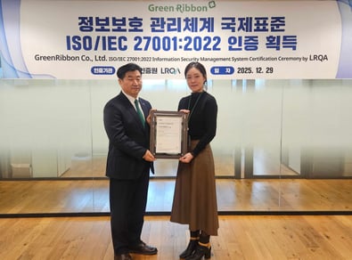 12월 29일 보험·의료 데이터 기반 인슈어테크 기업인 그린리본의 ISO 27001 (정보보안 경영시스템)인증 획득을 축하하는 인증수여식이 진행되었습니다.