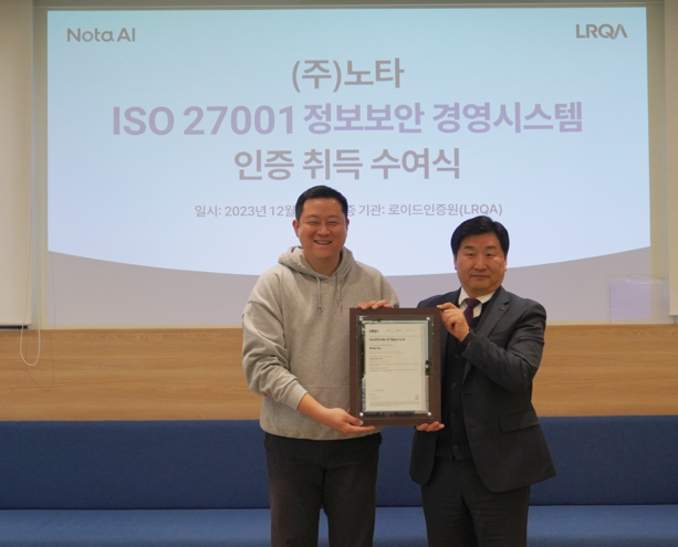 2023년 12월 4일 노타 AI의 ISO 27001 인증 취득을 축하하는 인증수여식이  진행되었습니다.
