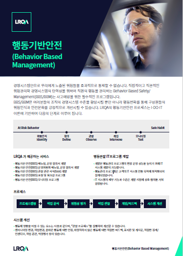 BBS/BBM은 귀사의 조직의 경영시스템 수준을 향상시킬 뿐만 아니라 행동변화를 통해 구성원들의 위험인식과 안전문화를 긍정적으로 개선시킬 수 있습니다. LRQA의 행동기반안전 프로세스를 확인해보세요.
